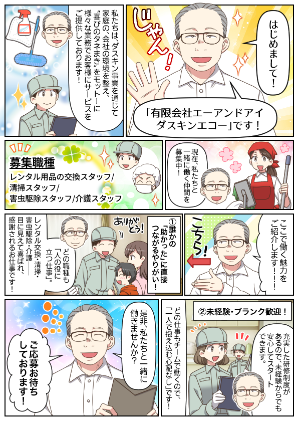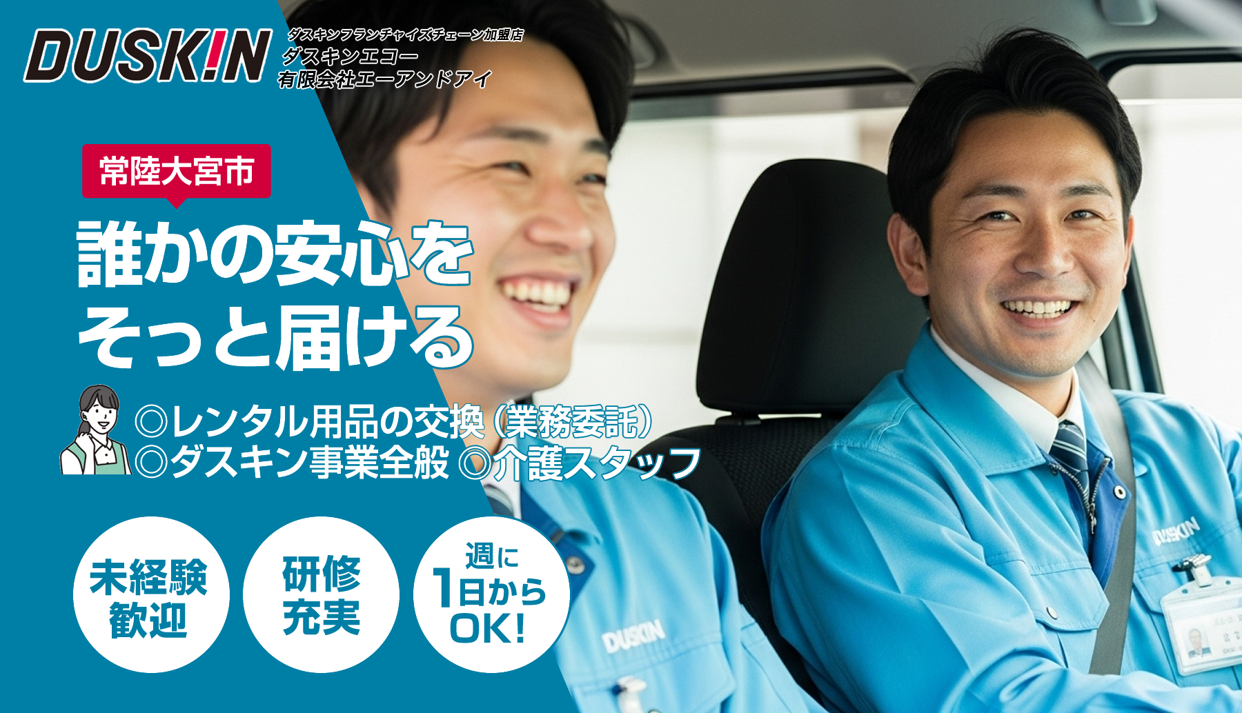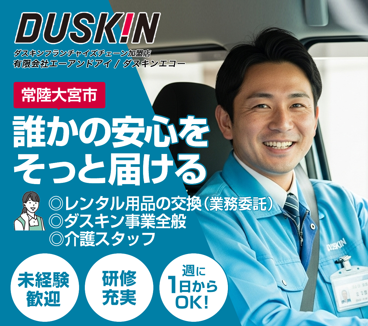 有限会社エーアンドアイは、ダスキンフランチャイズチェーン加盟店として茨城県北部エリアでご家庭のお掃除・介護ケアや事業者さま向けサービスを展開しています。この度、レンタル用品の交換スタッフ(業務委託)、総合職、介護スタッフ(パート・アルバイト)を募集中!未経験や資格なしでも安心して始められ、先輩がしっかりサポートします。お掃除の知識や技術も身につき、お客様の「ありがとう」が励みになるやりがいのある仕事です。私たちと一緒に働いてみませんか?